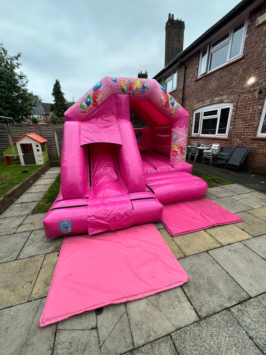 Experience the Pink Party Front Slide Adventure on the Pink Party Front Slide Combi Bouncy Castle in Bury- Cheshire- Stockport- Tameside- Oldham- Rochdale
