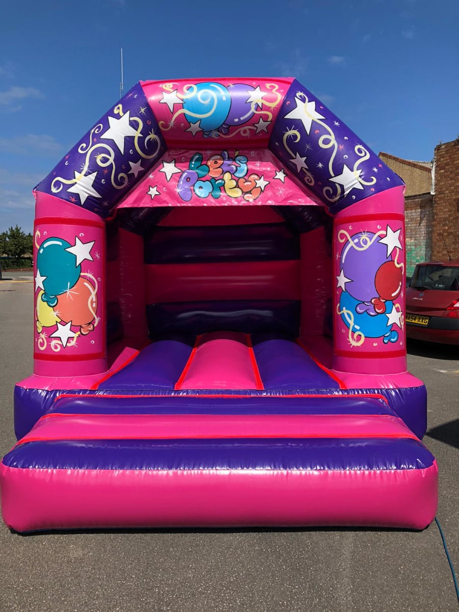 This lovely pink and purple bouncy castle is very eye catching and is perfect for any little girls day, Suitable for Birthday parties, weddings, christenings and sports days. It features amazing hand painted artwork of balloons and streamers, Velcro panels allow any artwork to be added.